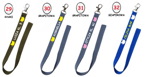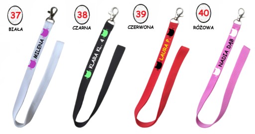 * smycz (na srebrnym karabińczyku) w wielu kolorach do wyboru, m.in. czarnym, białym, błękitnym, bordowym, zielonym, czerwonym, żółtym itp.