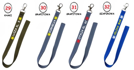 * smycz (na srebrnym karabińczyku) w wielu kolorach do wyboru, m.in. czarnym, białym, błękitnym, bordowym, zielonym, czerwonym, żółtym itp.