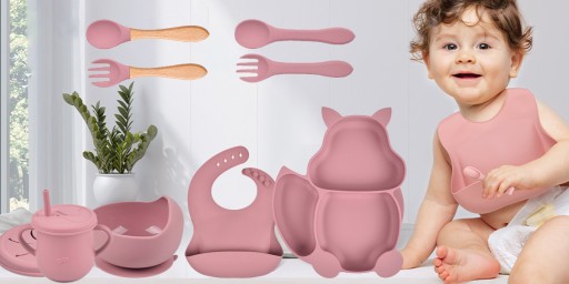 НАБОР СИЛИКОНОВОЙ ПОСУДЫ ДЛЯ ДЕТЕЙ И МЛАДЕНЦЕВ 9 ПРЕДМЕТОВ РОЗОВЫЙ 2024 г.