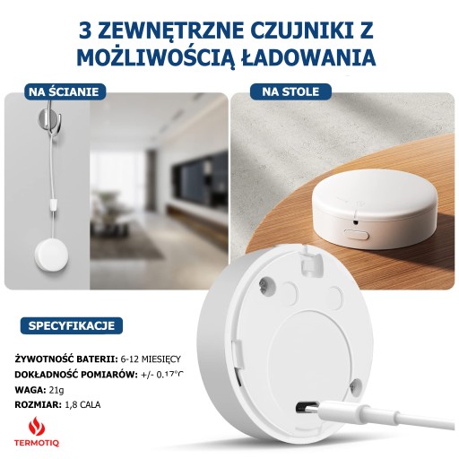 - 3 bezprzewodowe czujniki temperatury i wilgotności z możliwością ładowania przez kabel micro USB (czujniki można używać na zewnątrz, ale należy pamiętać, że nie są wodoodporne, powinny być umieszczony w miejscu, gdzie nie mają kontaktu z wodą)