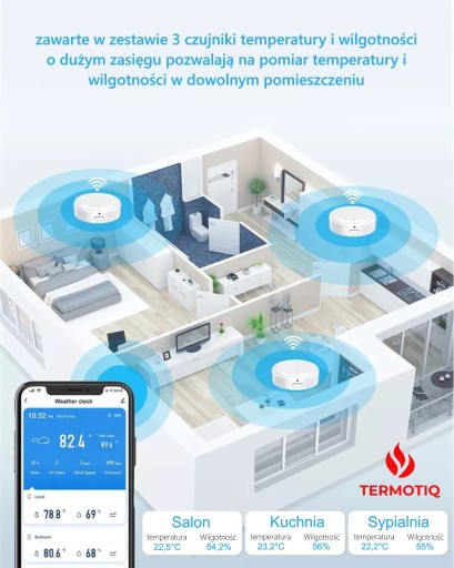 - zawarte w zestawie 3 czujniki temperatury i wilgotności o dużym zasięgu pozwalają na pomiar temperatury i wilgotności w dowolnym pomieszczeniu