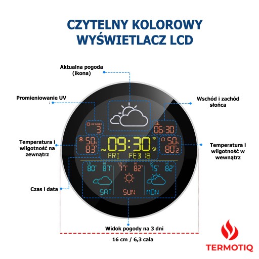 z prognozą pogody na 3 dni, czytelnym kolorowym wyświetlaczem i czujnikami z wbudowanym akumulatorem