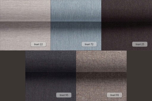 Tkanina Inari to pleciona tkanina meblowa imitująca naturalny len, której strukturę wyczuwa się w dotyku. Jest to materiał dość sztywny i nieco surowy, o prostym, mocnym splocie, idealnie pasujący do mebli o prostych formach. Tkanina Inari jest odporna na przetarcia, mechacenie i blaknięcie, a jej widoczny splot nadaje jej charakterystyczny wygląd. Dostępna jest w 16 przygaszonych kolorach, oferując szeroki wybór brązów i szarości.