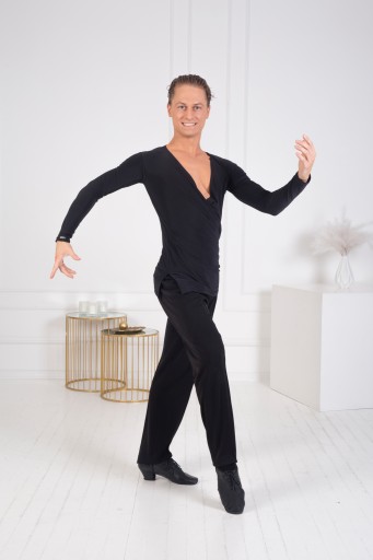 Męska czarna koszula Saser to idealna propozycja zarówno na treningi taneczne, jak i na turnieje. Jej głęboki dekolt z luźnym lejącym się przodem z delikatnym marszczeniem dodaje elegancji i stylu. Obcisłe rękawy podkreślają sylwetkę, jednocześnie zapewniając swobodę ruchów. Rozcięcia na dole koszuli dodają lekkości i sprawiają, że ubranie prezentuje się dynamicznie podczas tańca. To doskonały wybór dla każdego mężczyzny, który ceni sobie nie tylko wygodę, ale też modny wygląd na parkiecie.