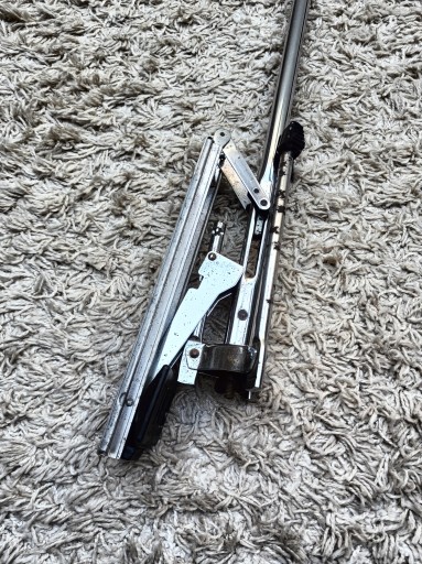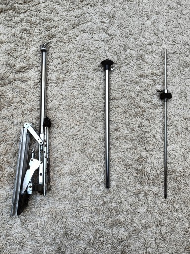 Statyw w stanie dobrym, sprawny technicznie, jeden z nitów został zastąpiony spinką rozporową, która spełnia swoje zadanie, oprócz tego statyw ze względu na swój wiek posiada troszkę nalotu i odprysków chromu, głownie na nogach.