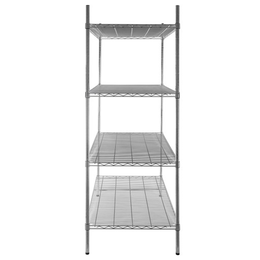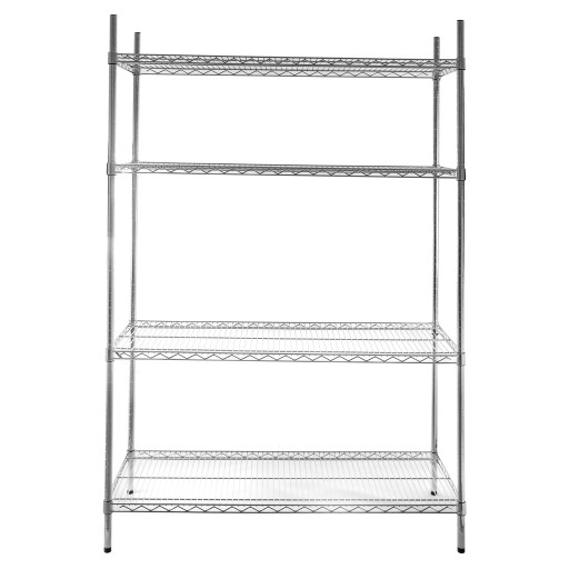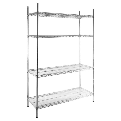 Druciany regał o wymiarach 180x180x45 cm składa się z czterech chromowanych półek wykonanych ze stali. Świetnie sprawdzi się w lokalu gastronomicznym np. do przechowywania naczyń kuchennych lub na magazynie jako praktyczny mebel zapewniający łatwy dostęp do składowanych na nim artykułów.