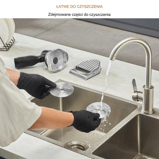 Części mające kontakt z żywnością wykonane są z wysokiej jakości stali nierdzewnej, co gwarantuje odporność na zużycie i korozję. Ostrza i akcesoria są łatwe do odłączenia, co znacznie ułatwia czyszczenie i utrzymanie higieny.