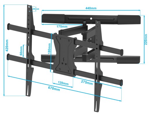 - dzięki długim podwójnym ramionom telewizor można zainstalować w dowolnej pozycji