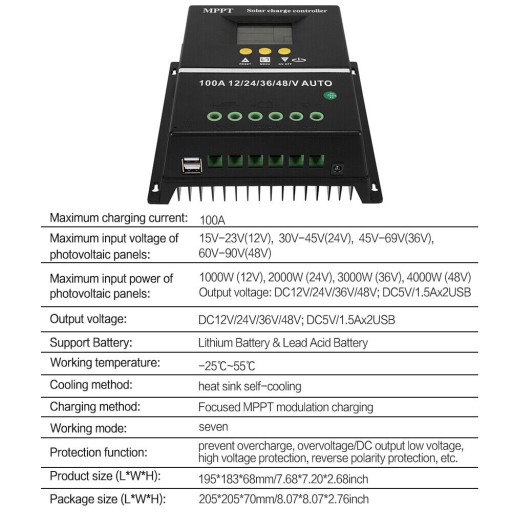 Контроллер заряда солнечной батареи MPPT 12 В/24 В/36 В/48 В ЖК-дисплей 100 А с самоохлаждением