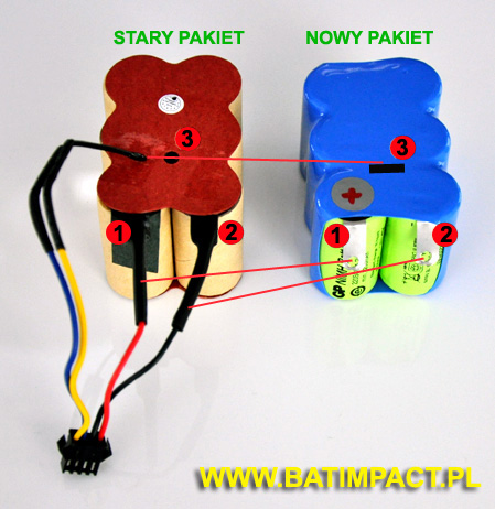 - Następnie odciąć i podłączyć kabelki (czerwony + i czarny -) do nowego pakietu (pozycja 1 i 2 na grafice)