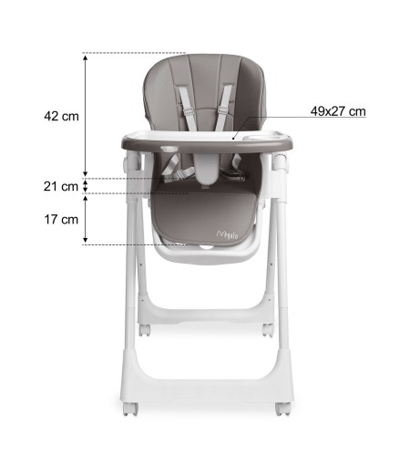 Składane krzesełko do karmienia Megalo jest lekkie i komfortowe. Niewielka waga i wygoda dzięki możliwości złożenia do niewielkich rozmiarów to mocne strony produktu. Obszerne siedzisko z regulowaną tacką i pasami bezpieczeństwa sprawiają, że maluszek będzie mógł komfortowo zjeść posiłek. Siedzisko jest wyłożone tapicerką z ekoskóry, którą łatwo zdjąć i wyczyścić. Regulowana wysokość krzesełka umożliwia wybór optymalnego ustawienia w zależności od potrzeb. Megalo posiada gumowane kółka z blokadą, dzięki którym łatwo się go przesuwa, nie niszcząc podłogi.