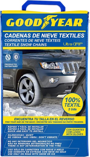 - 1 zestaw 2 tekstylnych łańcuchów śniegowych Goodyear UltraGrip, rozmiar L. Cichy, bez wibracji, szybki i łatwy montaż, bez uszkodzeń opon. Używać tylko na zaśnieżonych drogach. Łącznie z rękawiczkami. Maksymalna prędkość: 40 km/h