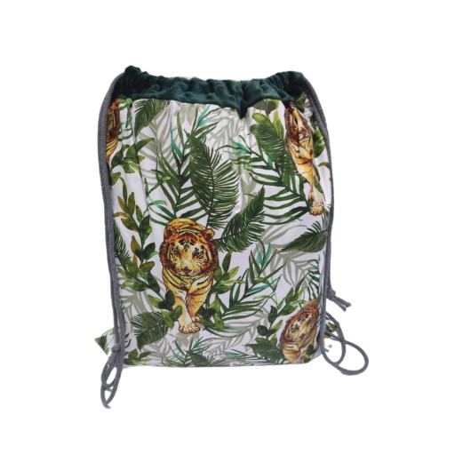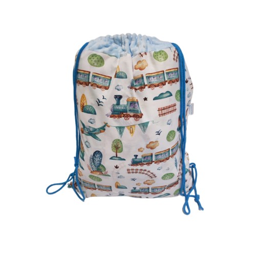 Worek szyjemy z kolorowej bawełny połączonej na górze z Minky. Worko - plecak posiada długi bawełniany sznurek, za pomocą którego w prosty sposób można zamknąć woreczek poprzez pociągnięcie za sznurki:)