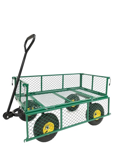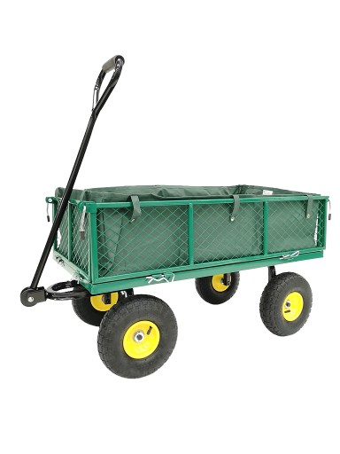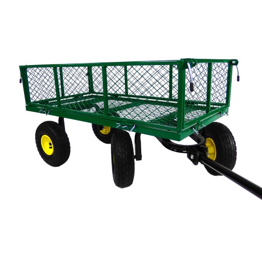 Wózek ogrodowy na pompowanych kołach z uchwytem do ciągnięcia.
