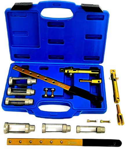Ściągacz dźwigniowy przeznaczony do demontażu sprężyn zaworowych w silnikach 8V/12V/16V/24V. W komplecie zestaw trzech różnych końcówek do demontażu sprężyn.