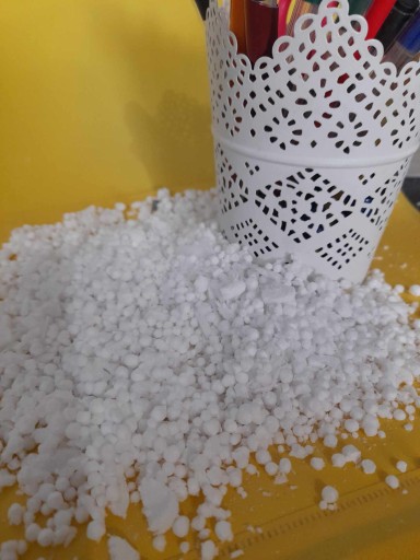 Przedmiotem aukcji jest 200 litrów regranulatu z domieszką styroduru xps - kulek o regularnych i nieregularnych kształtach.