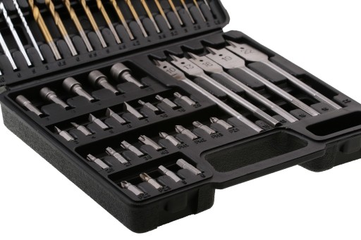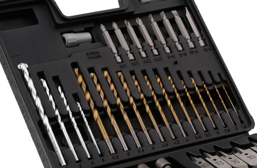 W komplecie znajdują się wiertła do drewna, metalu, betonu, żelaza, stali, tworzyw sztucznych, bity, nasadki i wiele, wiele więcej