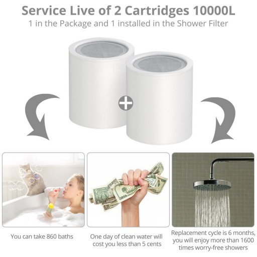 Przedmiotem oferty jest zestaw filtra prysznicowego z 20-stopniowowym poziomem filtracji, służący między innymi do zmiękczania twardej wody i usuwania chloru. Zestaw posiada 2 wymienne wkłady filtrujące (w tym jeden już zamontowany), uszczelki, taśmę teflonową i instrukcję montażu.