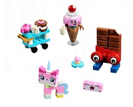 - Zestaw LEGO® z Kicią Rożek zawiera trzy figurki postaci z filmu LEGO® PRZYGODA 2™ do zbudowania z klocków: Kicię Rożek, Wafla-Wafla i Czekoladnika oraz wózek.