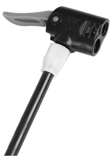 Klips pozwala na zapięcie węża na wentyl. Z kolei dźwignia do blokowania blokuje główkę pompki na wentylu.