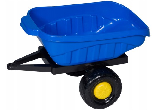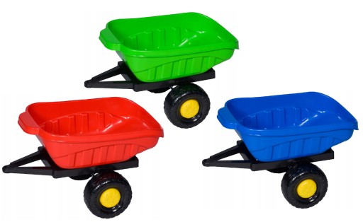 Przyczepka wykonana z atestowanego tworzywa bardzo wysokiej jakości Grube ścianki przyczepki gwarantują wytrzymałość, nie zawierają ostrych krawędzi Grube koła, Produkt zgodny z polską normą bezpiecznych zabawek ZASTOSOWANIE: