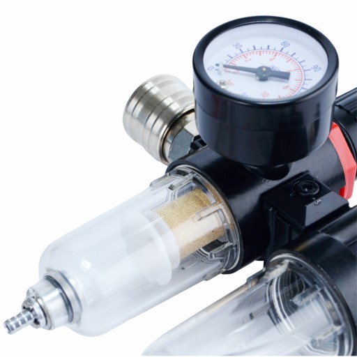 Urządzenie zapewnia pełną kontrolę nad jakością doprowadzanego powietrza. Reduktor z manometrem pozwala regulować ciśnienie w układach sprężonego powietrza.Odwadniacz zawierający separator wody oczyszcza sprężone powietrze z wilgoci, oleju, kondensatu i cząstek stałych. Filtruje sprężone powietrze z kropel wody, które powodują zacieki podczas malowania czy też korozję innych narzędzi. Dodatkowo urzadzenie wyposażone jest w naolejacz posiadający pokrętło umożliwiające precyzyjną regulację smarowania urządzeń pneumatycznych.