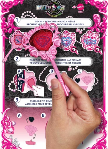 Draculaura za chwilę ma występ, ale nikt nie może jej znaleźć. Wypatruj wskazówek, aby odnaleźć jej kryjówkę oraz ponad 19 niespodzianek. Odkrywaj w 3 emocjonujących krokach: rozwiąż zagadkę, otwórz szafę i odsłoń niespodzianki!