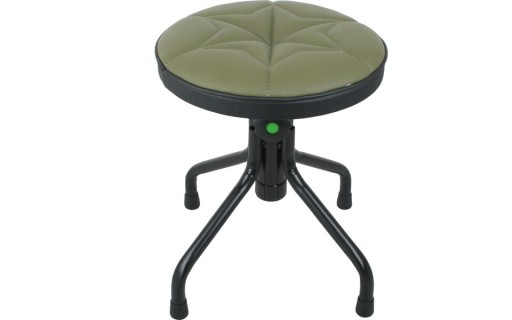 Wygodny taboret / stołek posiadający regulację wysokości poprzez kręcenie siedziskiem. Stelaż wykonany został z metalowych rur pokrytych bez połyskowym lakierem w kolorze czarnym. 4 odpowiedniej grubości rurki, na których spoczywa siedzisko, zakończone zostały gumami anty-poślizgowymi zapewniającymi stabilność całości. Regulacja wysokości posiada blokadę w postaci dużej śruby z wygodnym uchwytem. Siedzisko w kolorze zielonym, obszyte zostało wytrzymałym materiałem skóropodobnym, na którym przeszycia tworzą motyw gwiazdy. Wewnątrz znajduje się miękka gąbka, która zapewnia odpowiedni komfort w czasie gry.