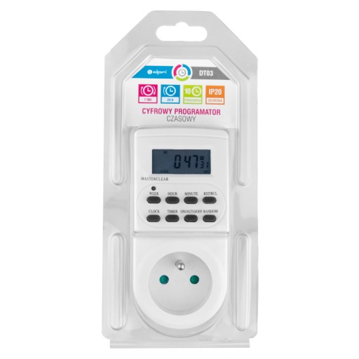 Przy użyciu elektronicznego programatora czasowego automatycznie włączysz i wyłączysz urządzenia elektryczne podłączone do gniazda w trybie 24-godzinnym oraz tygodniowym. Dzięki niemu zaprogramujesz godziny załączenia i wyłączenia sprzętów elektronicznych.