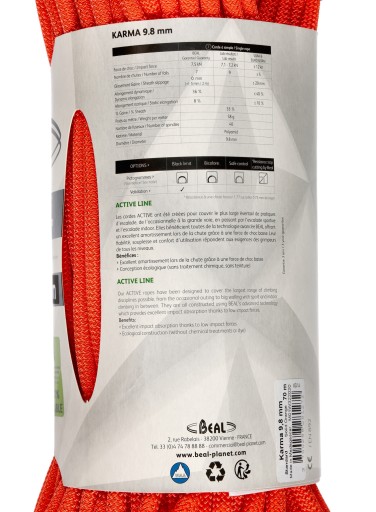 Beal Karma 9,8 mm to lina dynamiczna z linii Active zawierającej modele do początkujących i średniozaawansowanych wspinaczy - aktywnych, ale uprawiających sport raczej amatorski (lub sporadycznie). Modele Active Line budowane są przy użyciu zaawansowanej technologii, która zapewnia doskonałą amortyzację podczas odpadnięcia. Cechuje ją doskonały stosunek ceny do jakości oraz ekologiczna konstrukcja - bez obróbki chemicznej i stosowania dodatkowych powłok.