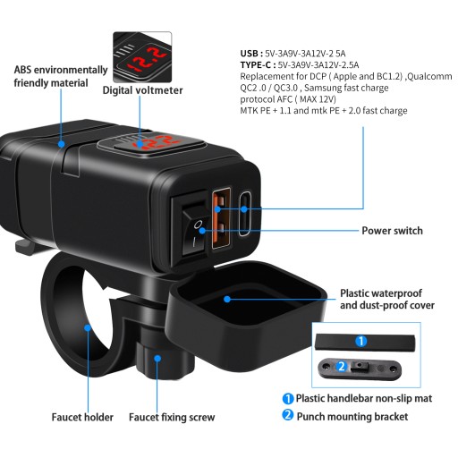 Szeroka kompatybilność - napięcie wejściowe ładowarki USB motocykla wynosi (12 V-24 V). Może automatycznie regulować napięcie wyjściowe w zależności od urządzenia (USB-A: 5 V/3,4 A, 9 V/2,5 A, 12 V/1,5 A TYPE-C: 5 V/3 A 9 V/3 A 12 V/2,5 A) i jest w pełni zamienny dla iPada, iPhone'a, HTC, Galaxy, BlackBerry, aparatu cyfrowego, PDA, odtwarzacza MP3, telefonu komórkowego i GPS (podpowiedź: trzymaj przycisk włączony podczas ładowania).