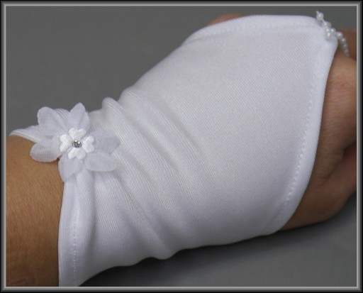Torebka komunijna z satyny ślubnej pierwszego gatunku w kształcie woreczka z usztywniająca wkładką pomagającą w zachowaniu kształtu nawet po obciążeniu. Na pozostałych aukcjach można dobrać pasujące do torebki np. Okapnik na świecę komunijną oraz rękawiczki komunijne z takim samym motywem ozdobnym.