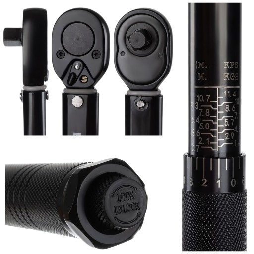 Łatwa regulacja momentu siły pozwala na precyzyjne zastosowanie klucza. Nasadkę blokujemy w kierunku "LOCK" zwalniamy blokadę "UNLOCK".