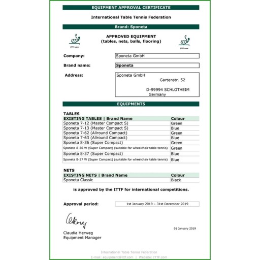 Stół z serii S7 – PROFI LINE klasa A Posiada atest ITTF Spełnai normy EN 14468-1 Posiada certyfikat PEFC Wyposażony w wysokiej jakości siatkę bawełnianą typu "World Champion" w kolorze czarnym Przeznaczony wyłącznie do pomieszczeń zamkniętych, nieodporny na warunki atmosferyczne Odpowiedni dla zawodników o największych umiejętnościach, doskonały do gry na najwyższym poziomie, do turniejów tenisa stołowego Nadaje się tylko do suchych pomieszczeń wewnątrz budynku Nieodporny na ciepło, zimno, bezpośrednie działanie promieni słonecznych i wilgoć (wilgotność względna powyżej 60%) Możliwość złożenia stołu do treningu jednoosobowego Regulacja wysokości za pomocą regulacji na tylnych nogachParametry: Wymiary: długość 274cm / szerokość 152,5cm / wysokość 76 cm (oficjalny światowy standard) Wymiary do przechowywania: długość 185 cm / szerokość 71 cm / wysokość 172 cm Waga brutto: 122 kg Waga netto: 111 kg Blat:- Płyta wiórowa 3tecWOOD premium 25 mm- Kolor: zielony- Wielokrotnie powlekany- Profil ramy A-60 mm, powlekany proszkowo- Kolor profilu ramy: czarny (RAL 9011) Podstawa:- Typ 3 (Semi-Compact, 2 częściowy) - ruchomy stół z podstawą i dwoma oddzielnymi skrzydłami, każde wyposażone w składaną podstawę.- Prostokątny profil 60 x 40 mm- 4 skrętne koła o średnicy 100 mm z bieżnikiem gumowym na każdym blacie, 2 z blokadą- Regulacja nóżek (do 25 mm) pozwala na zachowanie równowagi stołu na nierównych powierzchniach- Kolor stelażu: szary aluminium (RAL 9007)- Prosty i automatyczny mechanizm blokujący: System uchwytowy (Handle System) Uchwyt z metalową rączką pod stołem odblokowuje jednocześnie oba zabezpieczenia W zestawie: stół, siatka w kolorze czarnym, instrukcja montażu Marka: Sponeta / Linia: Profiline Norma europejska: EN-Norm 14468-1Sponeta to Niemiecka marka zajmująca się produkcją stołów i akcesoriów do tenisa stołowego, której produkty są dostarczane do 90 krajów Wieloletnie doświadczenie oraz doskonałe opinie dają gwarancje zadowolenia z zakupu Produkty firmy Sponeta są cenione zarówno przez profesjonalistów jak i amatorów tenisa stołowego.TOWAR WRAŻLIWY NA USZKODZENIA W TRANSPORCIE, PROSZĘ O SPRAWDZENIE PACZKI PODCZAS ODBIORU PRZY KURIERZE.