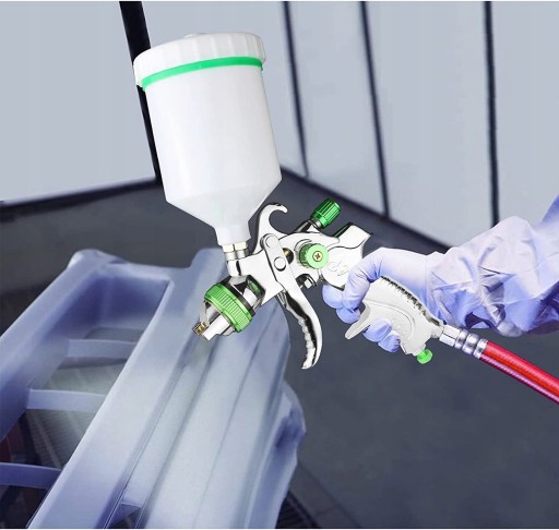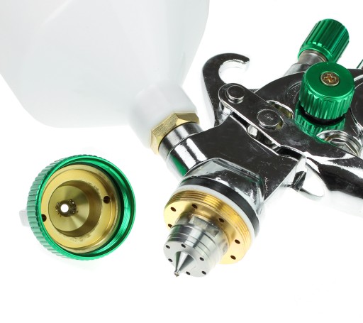 - Pistolet wykonany jest w technice HVLP, jest to skrót od High Volume Low Pressure, co oznacza dużą ilość powietrza przy jednocześnie niskim ciśnieniu