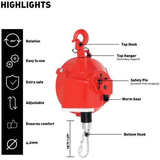 Lina ma długość 1.3 m i zapewnia optymalną swobodę ruchów podczas pracy. Balanser zawsze trzyma narzędzie pod ręką, dzięki czemu miejsce pracy, np. w hali montażowej, jest zawsze uporządkowane i gotowe do użycia. Dodatkowo obudowę można zabezpieczyć kolejną linką stalową, w tym celu do urządzenia przymocowane jest oczko. Wybierając balanser dla swojego sprzętu, upewnij się, że minimalna waga nie spadła poniżej, a maksymalna nie została przekroczona!