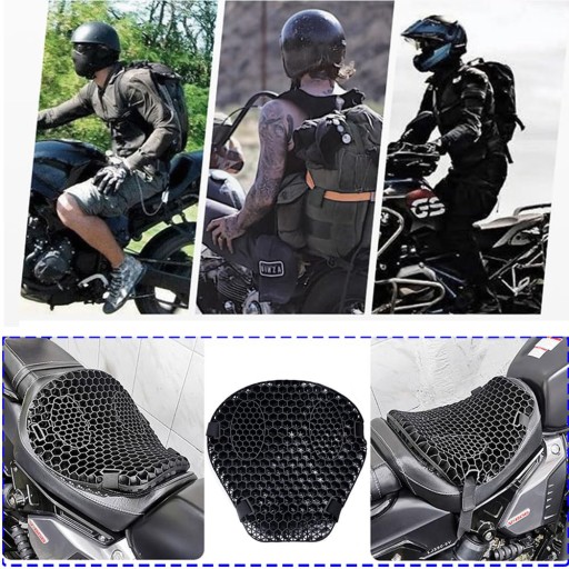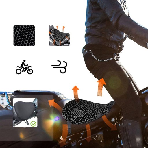 Pokrowiec na siedzenie motocyklowe został zaprojektowany w kształcie plastra miodu 3D, dzięki czemu powietrze może krążyć szybciej niż poduszka gąbkowa, co skutecznie pomaga w chłodzeniu i rozprowadzaniu ciepła, dzięki czemu możesz trzymać się z dala od potu i gorąca.