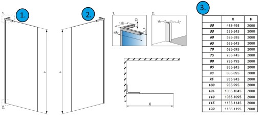 2. Bez brodzika z zachowaniem wymiarów zewnętrznych kabiny – wymiary X1 i X2 są wymiarami do zewnętrznej krawędzi profilu.