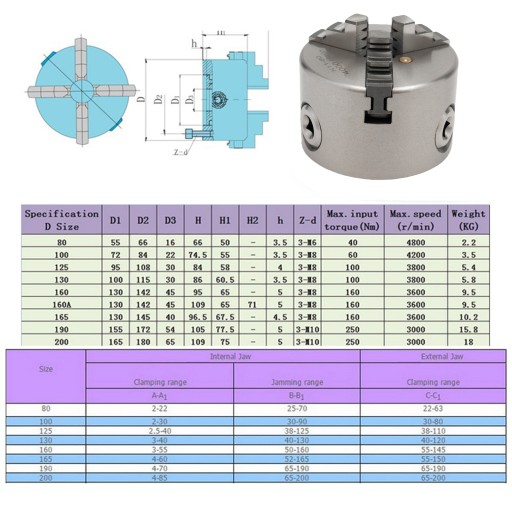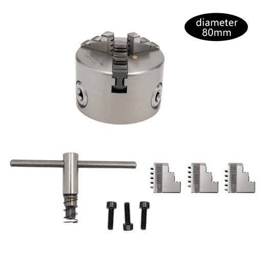 - 1 szt. Samocentrujący uchwyt tokarski 3 szczękowy ze szczękami, kluczem, śrubami mocującymi