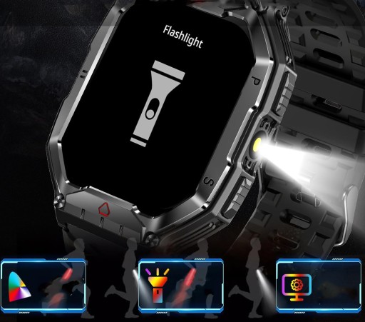 - ☑️Ponadto wytrzymały inteligentny zegarek jest wyposażony w małą latarkę z boku, która zapewnia wygodną funkcję podczas przygód na świeżym powietrzu i pomaga oświetlić drogę w naturze.