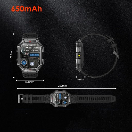 - ☑️Ten wojskowy zegarek jest wyposażony w mocną baterię 650 mAh, która zapewnia doskonałą wydajność i długą żywotność.