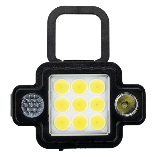 Latarka posiada rozkładany uchwyt, który umożliwia jej zawieszenie w dowolnym miejscu lub postawienie na płaskiej powierzchni. To dodatkowa zaleta, która pozwala na wygodne ustawienie źródła światła w różnych sytuacjach, np. podczas biwaków, gdy potrzebujesz oświetlenia w namiocie, lub w warsztacie, gdy potrzebujesz stabilnego źródła światła na stole roboczym.