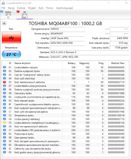 Poniżej przedstawiamy wynik raportu SMART sprzedawanego dysku.
