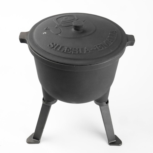 Kociołek wyposażony jest w solidną pokrywę z otworem, trzy stabilne nóżki oraz przykręcany uchwyt mocno dociskający pokrywę. Grube dno kociołka żeliwnego sprawia, że przygotowane dania wolną stygną. Żeliwo bardzo dobrze i równomiernie przewodzi ciepło.