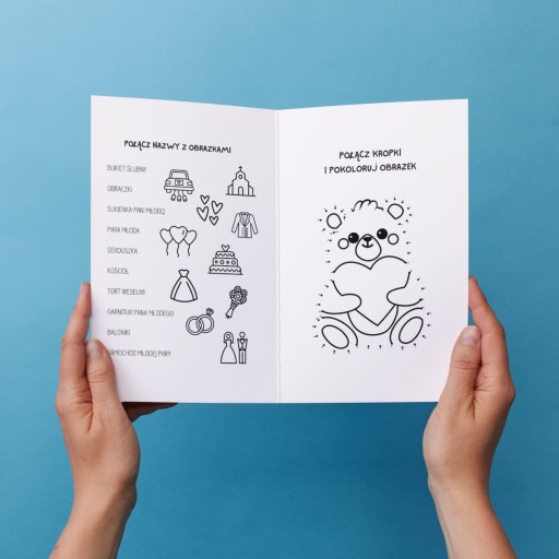 W książeczce znajdują się zadania o różnym stopniu trudności, dlatego dziecko w każdym wieku powinno znaleźć coś dla siebie. Z pewnością będzie to atrakcja dla dzieciaków, która umili im czas w trakcie weselnej zabawy! :)
