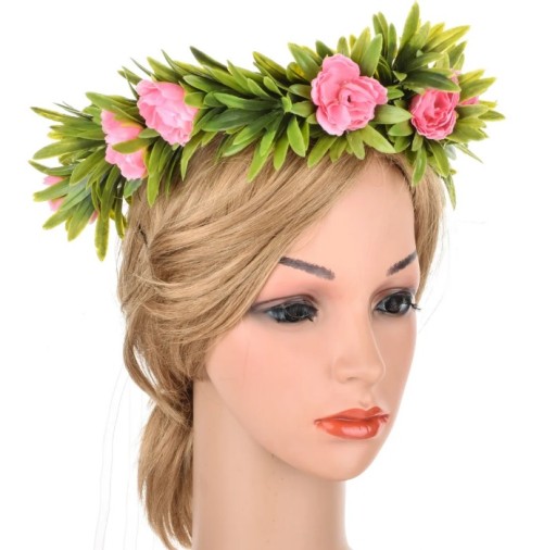 - Wianek z różowymi kwiatkami, wiązany na wstążeczkę, która jest również zdobieniem,