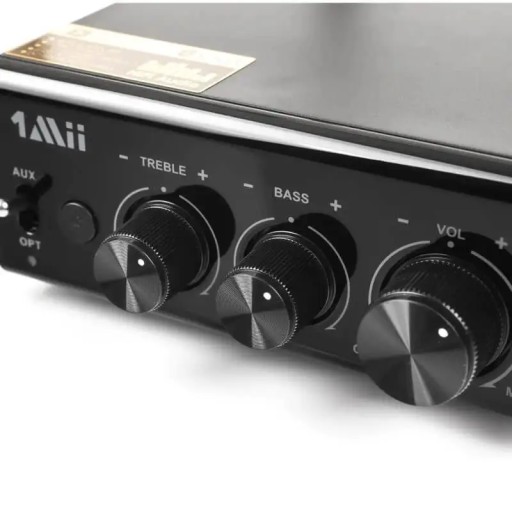 Wzmacniacz dźwięku 1Mii B08+ posiada pokrętła regulacje basu, tonów wysokich oraz głośności, dzięki czemu można w łatwy sposób dostosować dźwięk do swoich preferencji. Dzięki temu, urządzenie pozwala na obsługę nawet dwóch głośników 100W.