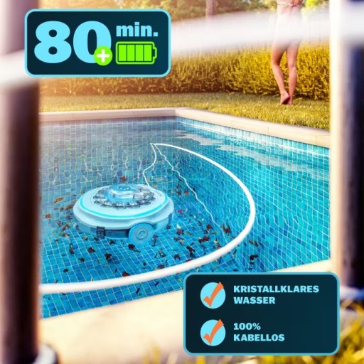 Bezprzewodowy odkurzacz basenowy działa tylko na ziemi - podczas czyszczenia możesz bez przeszkód pływać w basenie bez plątaniny kabli. Dzięki dużej przepustowości wynoszącej 80 l/min masz wystarczającą moc, aby wyczyścić powierzchnię do 80 m². W zestawie znajduje się stacja ładująca i siatka filtracyjna ze stali nierdzewnej.