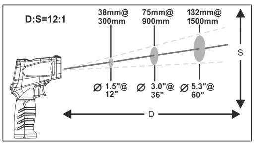 WIELKOŚĆ PUNKTU POMIARU ZMIENIA SIĘ WRAZ Z ODLEGŁOŚCIĄ W STOSUNKU 12:1