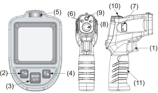 - Wskaźnik laserowy: wielopunktowy (dokładnie zaznacza obszar i średnicę pomiaru,